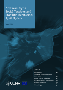 This is the second report in an ongoing pilot study by COAR to monitor stability and social tensions in northeast Syria. Data collected and verified by COAR field researchers has been classified and analysed according to a broad set of indicators. This brief report assesses data collected in April 2021. As with the previous assessment of March data (see: Northeast Syria Social Tensions and Stability Monitoring Pilot Project – March), this report breaks down three overarching dynamics: Arab tribes’ struggle to exert local autonomy; Islamic State (IS) insurgency; and the security-driven local engagement strategies of the Autonomous Administration and Syrian Democatic Forces (SDF).